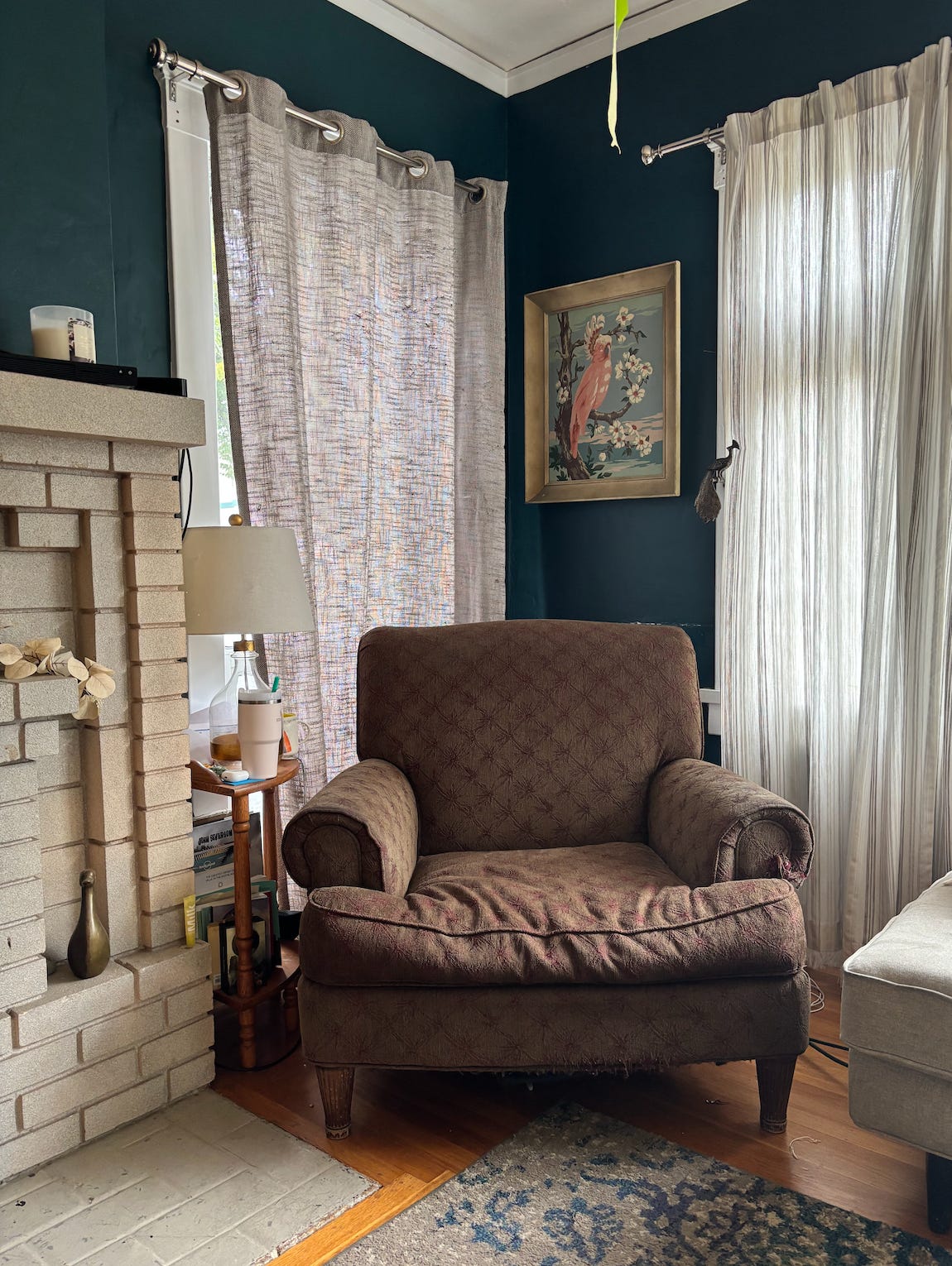 My husband’s chair sits opposite mine. It’s mustard-colored valor from the ‘60s. A multicolored knitted blanket is draped over it. The chair sits on a yellow and red round, braided rug. Above the chair, an amber lamp hangs from a gold chain. It’s all just as ugly as you are imagining. On the wall above the chair is a painting of a hawk on a branch in a gilded gold frame. At night he sits under the amber glow, legs crossed, looking down the glasses on the tip of his nose and reads comic books.