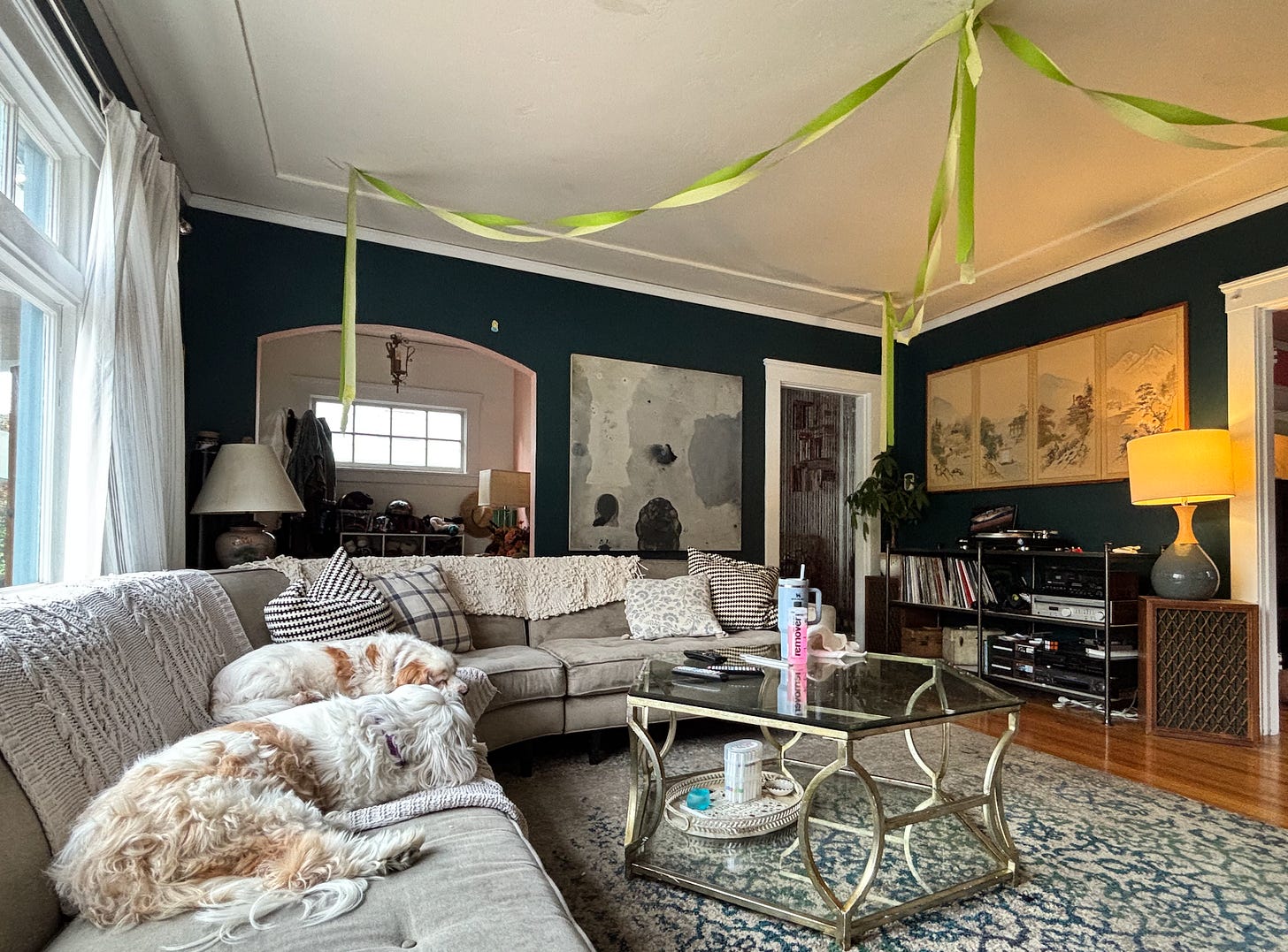 Streamers from my son’s 19th birthday last week still hang from the ceiling. On the heavy octagonal glass coffee table we move out for dance parties are my 12 year old daughter’s nail polish remover and nail files, her blue Stanley cup, and a wet wash cloth I gave her earlier to cool her fever. There are three remote controls. None of them work the TV.